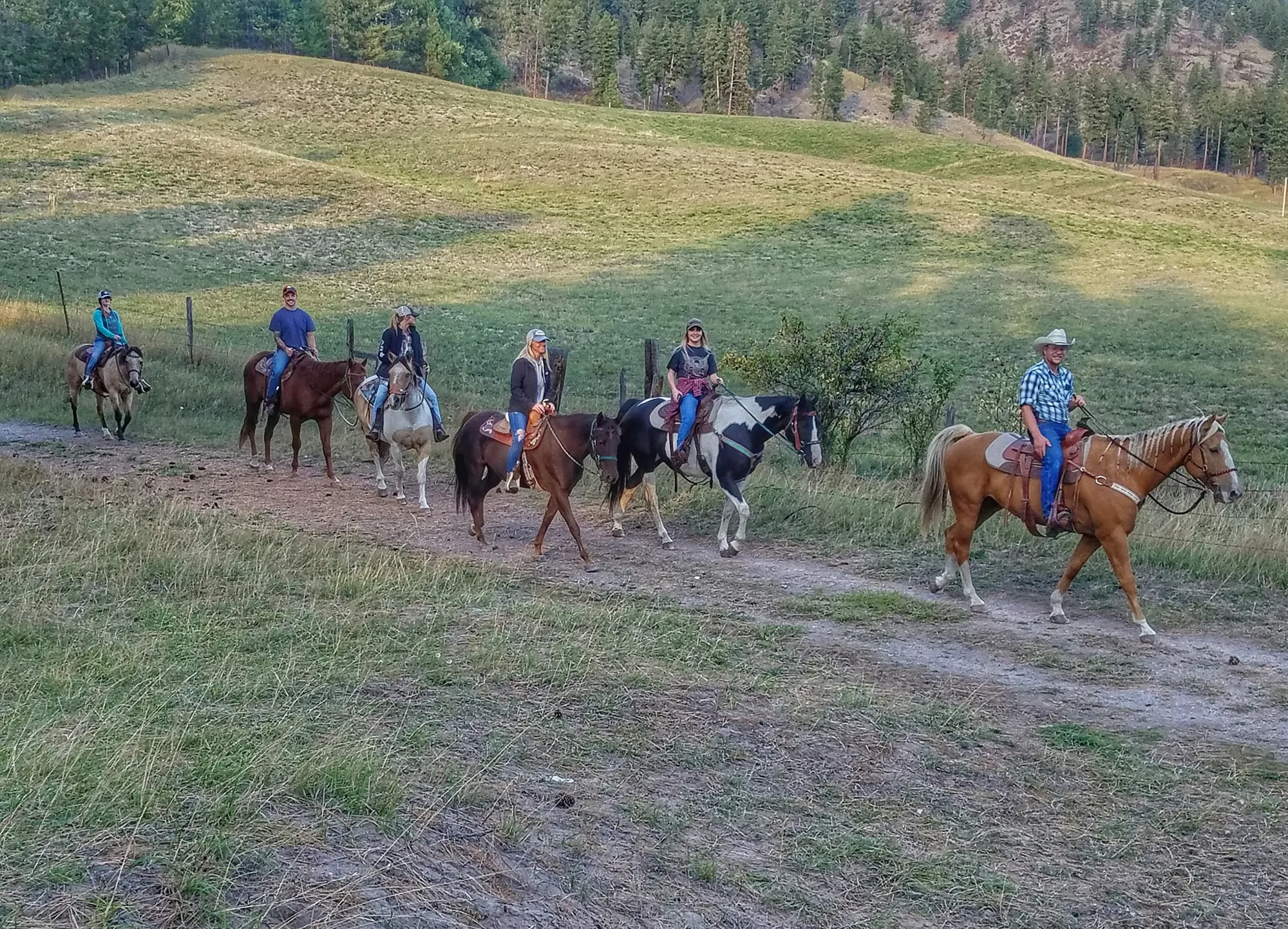 Take a ride with us through Montana's beautiful forests! Rides are on clearly marked trails and old roads over easy terrain and gradual hills on a Private Ranch and lolo national forest, the way Montana was meant to be seen! Our guides, wranglers and provided equipment make your ride the best it can be. We start you off by having guests meet here at the ranch, get fitted for saddles, helmets etc. Use the outhouse and get introduced to their horses. then we load up and trailer the horses 2 miles to our trail head. guests are welcome to ride along in the truck or follow in their own vehicle.